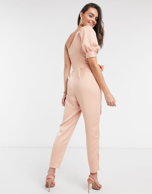 ASOS DESIGN one shoulder puff sleeve jumpsuit in blush | ASOS
