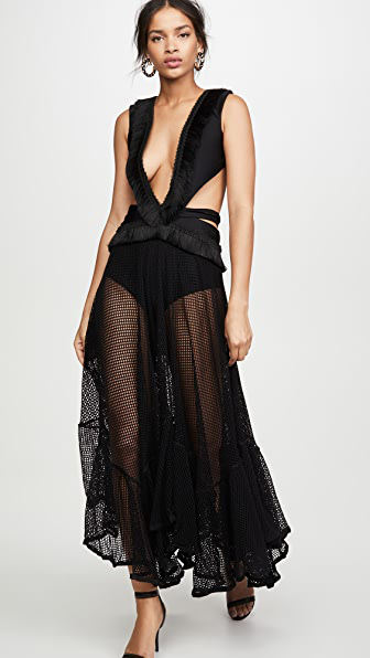 fringe and mesh cutout maxi dress off