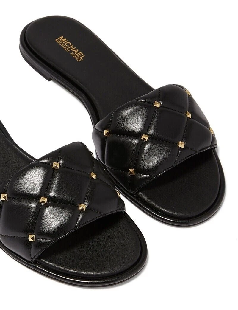 MICHAEL KORS Rina Slides Open Toe Flat Mules Black Leather Gold Studs Size 7 NIB | eBay